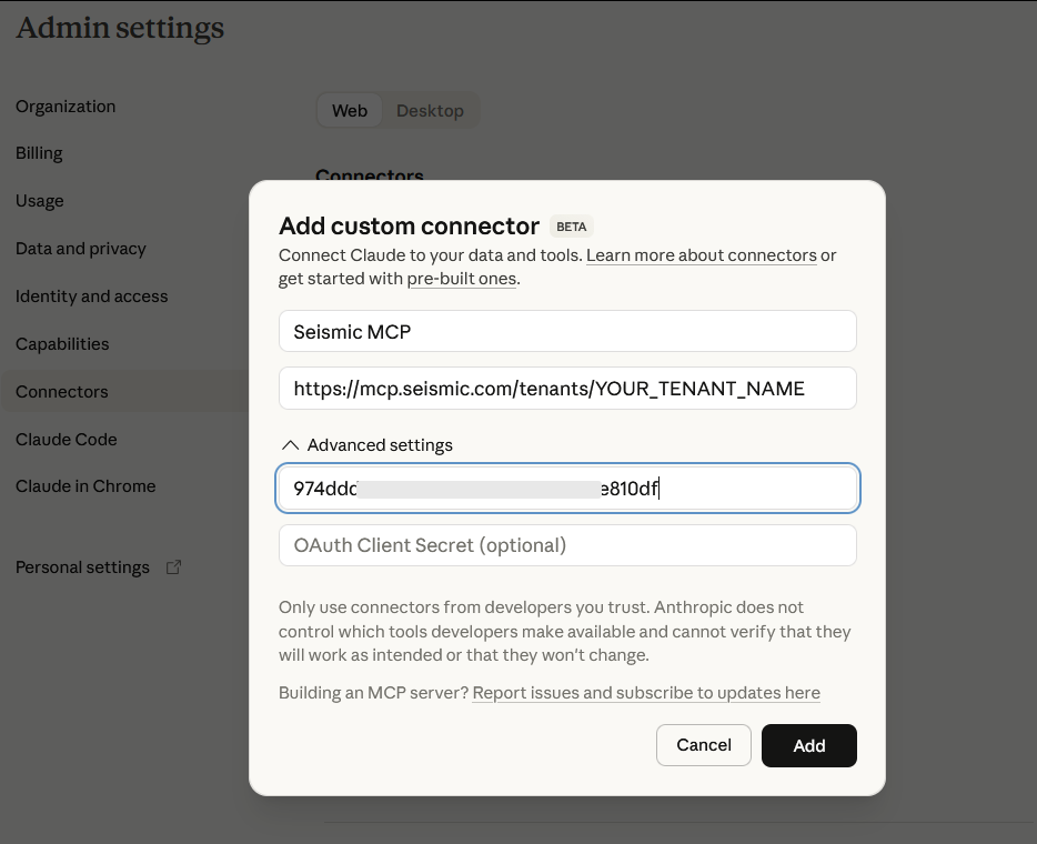 How to connect to Seismic's Remote MCP Server to Claude