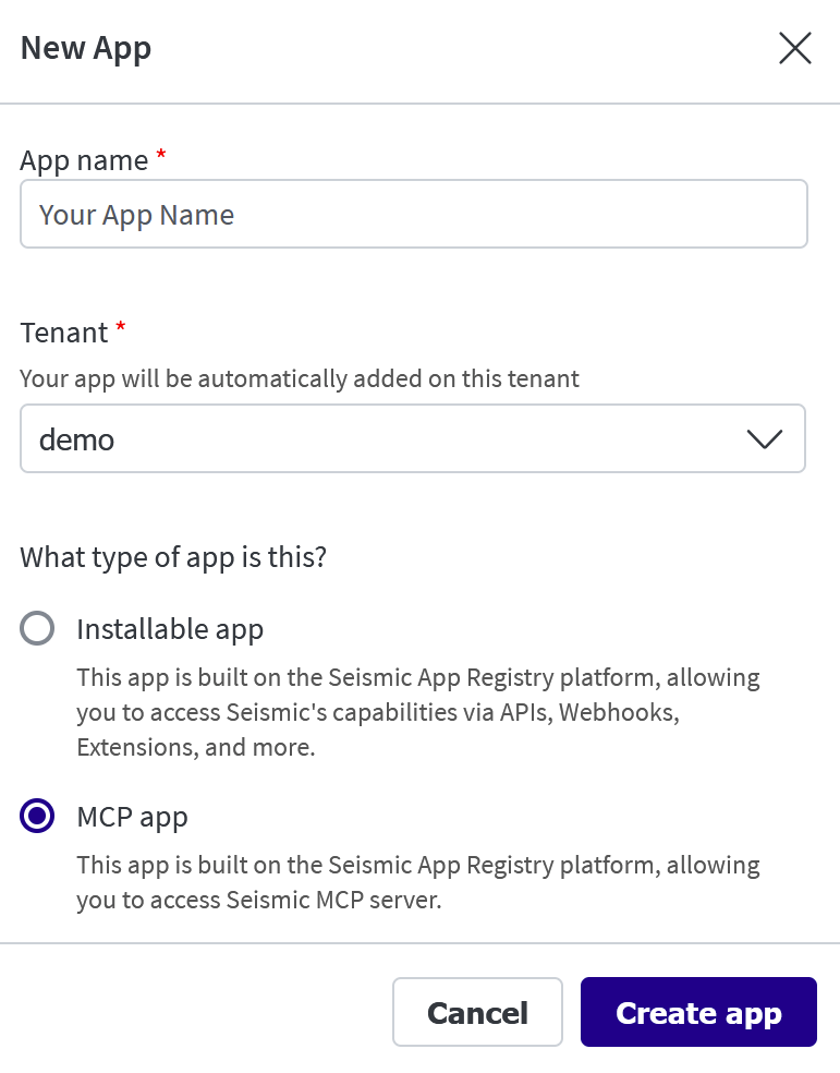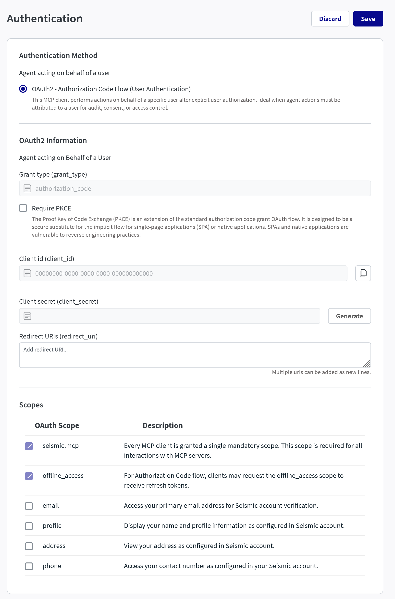 Only seismic.mcp scope is supported and is be selected by default. Optional OIDC connect scopes can be selected.