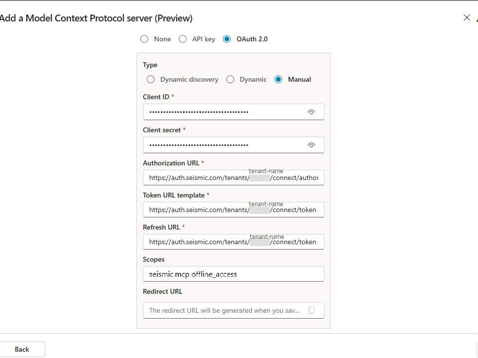 Update details for Seismic MCP Server URL and associate it with the OAuth client you created.