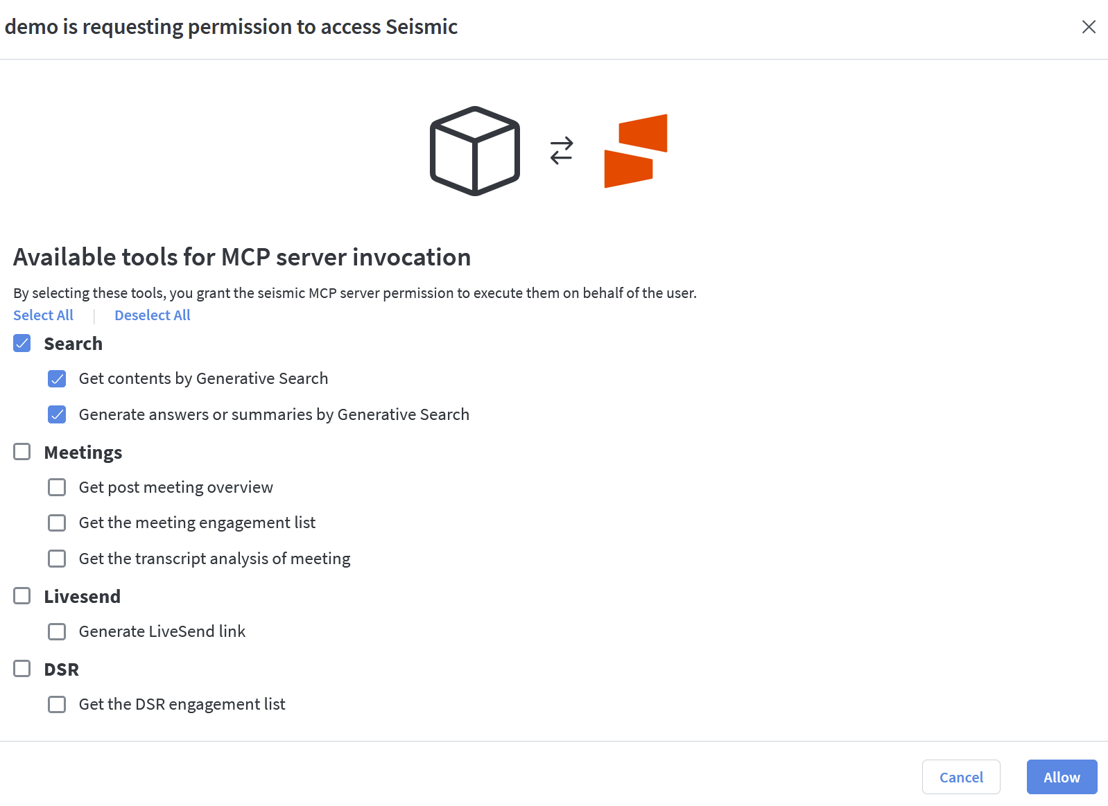 - Obtain an access token with the seismic.search and seismic.mcp scopes